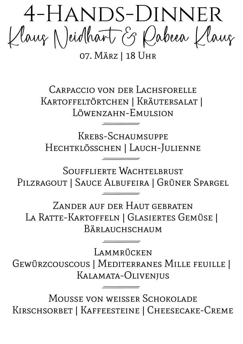 Unser Küchenchef Rabeea Klaus und Gastkoch Klaus Neidhart, Pionier der Nouvelle Cuisine in der Bodenseeregion und als bester Fischkoch am Bodensee bekannt, kreieren gemeinsam ein 6-Gang-Menü, das handwerkliche Präzision, feine Aromatik und kulinarische Kreativität vereint.